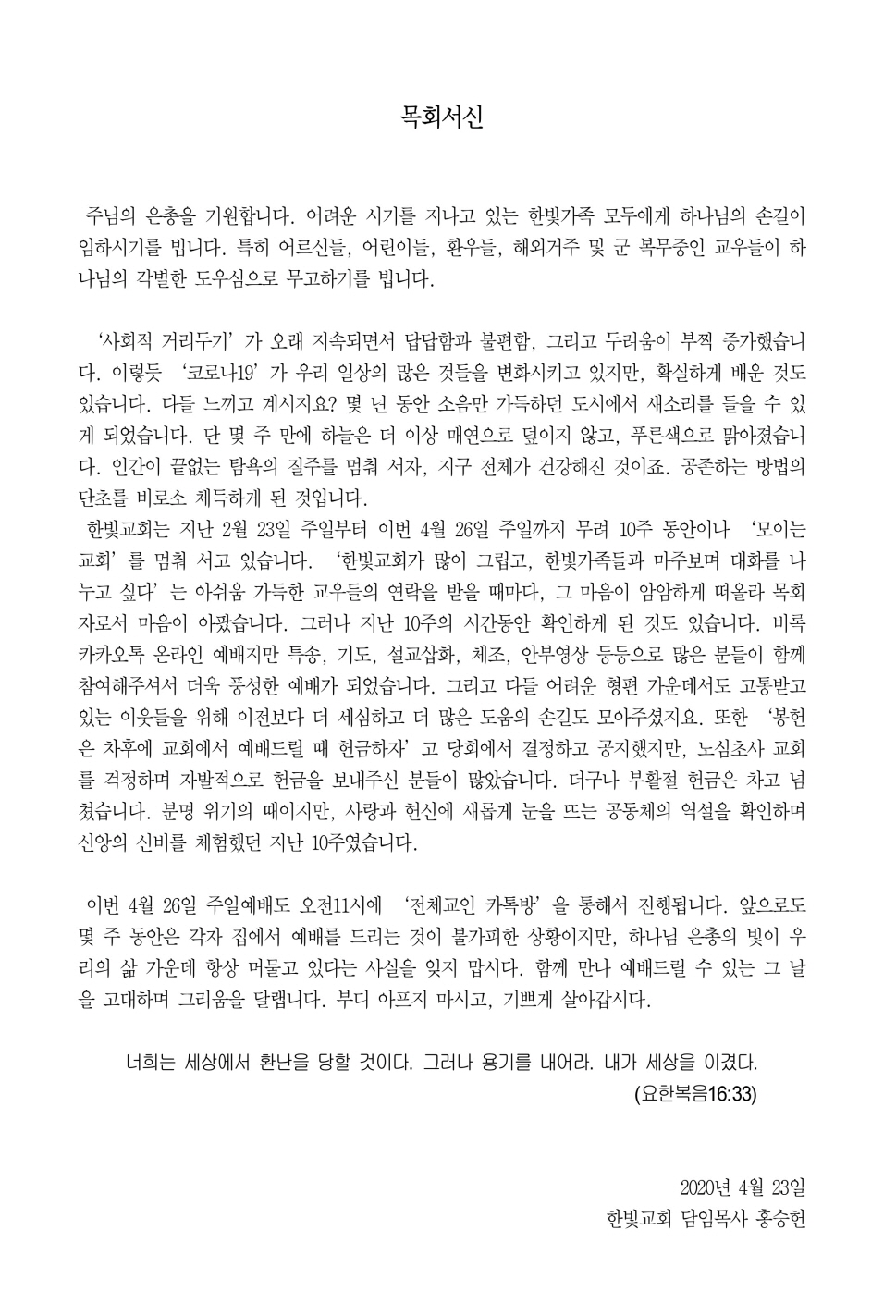 ÇѺû±³È¸´Â Áö³ 2¿ù 23ÀÏ ÁÖÀϺÎÅÍ À̹ø 4¿ù 26ÀÏ ÁÖÀϱîÁö ¹«·Á 10ÁÖ µ¿¾ÈÀ̳ª ¡®¸ðÀÌ´Â ±³È¸¡¯¸¦ ¸ØÃç ¼°í ÀÖ½À´Ï´Ù. ¡®ÇѺû±³È¸°¡ ¸¹ÀÌ ±×¸³°í, ÇѺû°¡Á·µé°ú ¸¶ÁÖº¸¸ç ´ëȸ¦ ³ª´©°í ½Í´Ù¡¯´Â ¾Æ½¬¿ò °¡µæÇÑ ±³¿ìµéÀÇ ¿¬¶ôÀ» ¹ÞÀ» ¶§¸¶´Ù, ±× ¸¶À½ÀÌ ¾Ï¾ÏÇÏ°Ô ¶°¿Ã¶ó ¸ñȸÀڷμ ¸¶À½ÀÌ ¾ÆÆÍ½À´Ï´Ù. ±×·¯³ª Áö³ 10ÁÖÀÇ ½Ã°£µ¿¾È È®ÀÎÇÏ°Ô µÈ °Íµµ ÀÖ½À´Ï´Ù. ºñ·Ï īī¿ÀÅå ¿Â¶óÀÎ ¿¹¹èÁö¸¸ Ư¼Û, ±âµµ, ¼³±³»ðÈ, üÁ¶, ¾ÈºÎ¿µ»ó µîµîÀ¸·Î ¸¹Àº ºÐµéÀÌ ÇÔ²² Âü¿©ÇØÁּż ´õ¿í dz¼ºÇÑ ¿¹¹è°¡ µÇ¾ú½À´Ï´Ù. ±×¸®°í ´Ùµé ¾î·Á¿î ÇüÆí °¡¿îµ¥¼µµ °íÅë¹Þ°í ÀÖ´Â ÀÌ¿ôµéÀ» À§ÇØ ÀÌÀüº¸´Ù ´õ ¼¼½ÉÇÏ°í ´õ ¸¹Àº µµ¿òÀÇ ¼Õ±æµµ ¸ð¾ÆÁÖ¼ÌÁö¿ä. ¶ÇÇÑ ¡®ºÀÇåÀº Â÷ÈÄ¿¡ ±³È¸¿¡¼ ¿¹¹èµå¸± ¶§ Çå±ÝÇÏÀÚ¡¯°í ´çȸ¿¡¼ °áÁ¤ÇÏ°í °øÁöÇßÁö¸¸, ³ë½ÉÃÊ»ç ±³È¸¸¦ °ÆÁ¤Çϸç ÀÚ¹ßÀûÀ¸·Î Çå±ÝÀ» º¸³»ÁֽŠºÐµéÀÌ ¸¹¾Ò½À´Ï´Ù. ´õ±¸³ª ºÎȰÀý Çå±ÝÀº Â÷°í ³ÑÃÆ½À´Ï´Ù. ºÐ¸í À§±âÀÇ ¶§ÀÌÁö¸¸, »ç¶û°ú Çå½Å¿¡ »õ·Ó°Ô ´«À» ¶ß´Â °øµ¿Ã¼ÀÇ ¿ª¼³À» È®ÀÎÇÏ¸ç ½Å¾ÓÀÇ ½Åºñ¸¦ üÇèÇß´ø Áö³ 10ÁÖ¿´½À´Ï´Ù.
