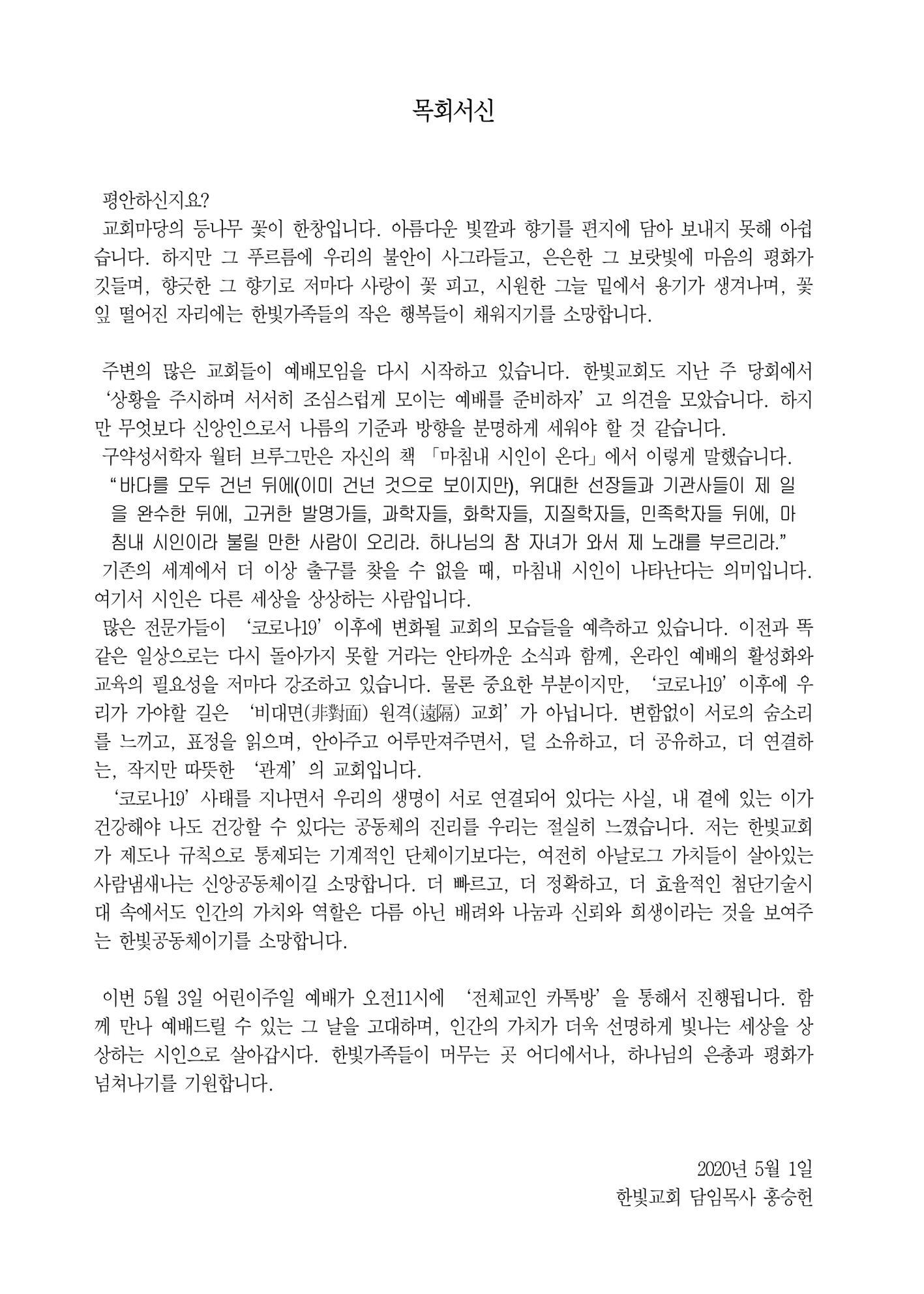 ¸¹Àº Àü¹®°¡µéÀÌ ¡®Äڷγª19¡¯ÀÌÈÄ¿¡ º¯ÈµÉ ±³È¸ÀÇ ¸ð½ÀµéÀ» ¿¹ÃøÇϰí ÀÖ½À´Ï´Ù. ÀÌÀü°ú ¶È°°Àº ÀÏ»óÀ¸·Î´Â ´Ù½Ã µ¹¾Æ°¡Áö ¸øÇÒ °Å¶ó´Â ¾ÈŸ±î¿î ¼Ò½Ä°ú ÇÔ²², ¿Â¶óÀÎ ¿¹¹èÀÇ È°¼ºÈ¿Í ±³À°ÀÇ Çʿ伺À» Àú¸¶´Ù °Á¶Çϰí ÀÖ½À´Ï´Ù. ¹°·Ð Áß¿äÇÑ ºÎºÐÀÌÁö¸¸, ¡®Äڷγª19¡¯ÀÌÈÄ¿¡ ¿ì¸®°¡ °¡¾ßÇÒ ±æÀº ¡®ºñ´ë¸é(ÞªÓߨü) ¿ø°Ý(êÀ̰) ±³È¸¡¯°¡ ¾Æ´Õ´Ï´Ù. º¯ÇÔ¾øÀÌ ¼·ÎÀÇ ¼û¼Ò¸®¸¦ ´À³¢°í, Ç¥Á¤À» ÀÐÀ¸¸ç, ¾È¾ÆÁÖ°í ¾î·ç¸¸Á®ÁÖ¸é¼, ´ú ¼ÒÀ¯Çϰí, ´õ °øÀ¯Çϰí, ´õ ¿¬°áÇÏ´Â, ÀÛÁö¸¸ µû¶æÇÑ ¡®°ü°è¡¯ÀÇ ±³È¸ÀÔ´Ï´Ù.
